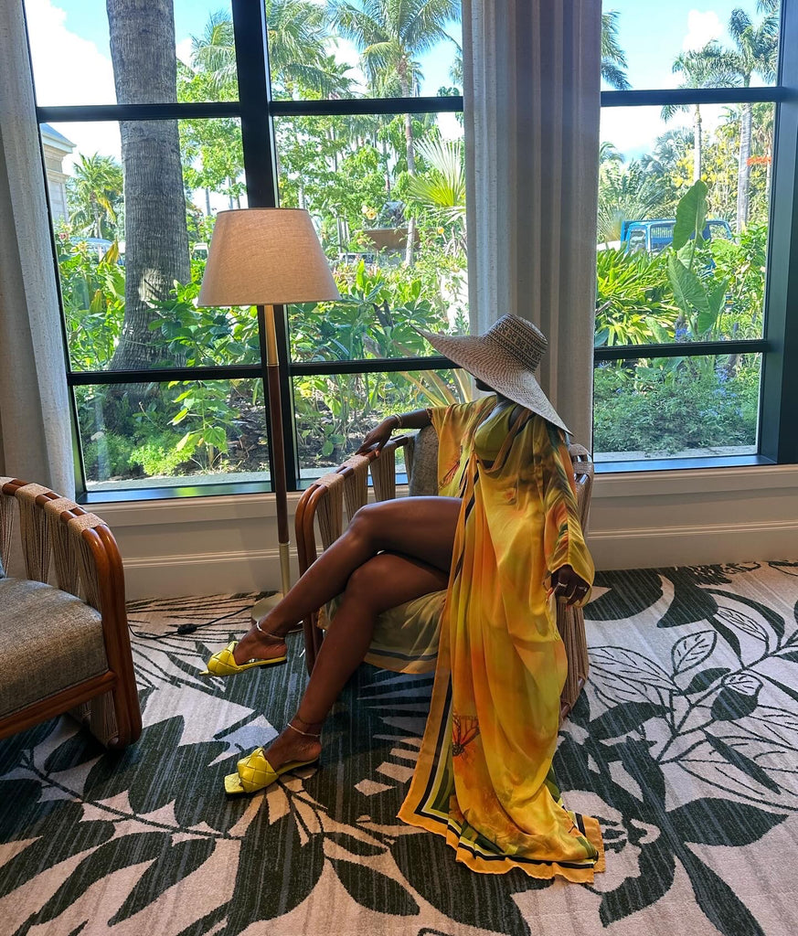 Model is styled in our kaftan and our 90cm Negril hand-woven hat in black (hat and bathing suit not included). Matching silk scarf also available.