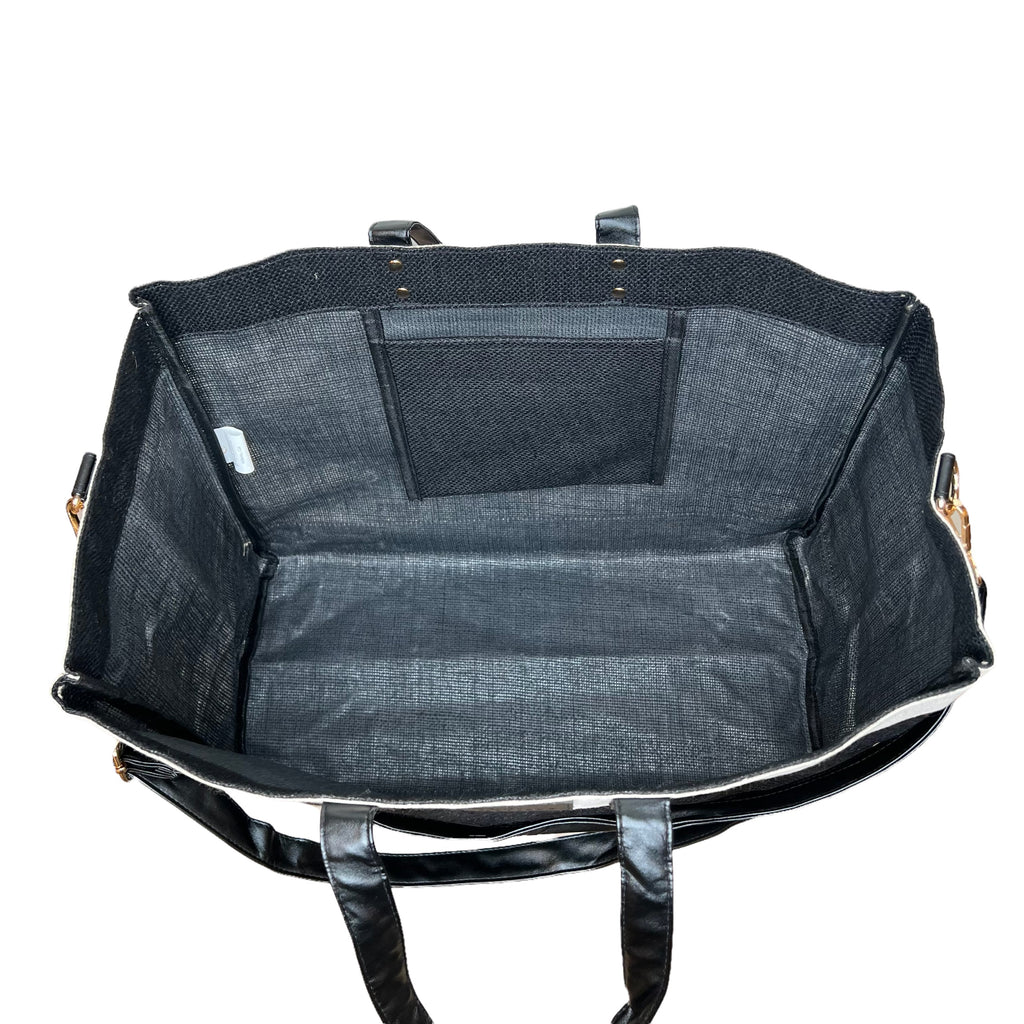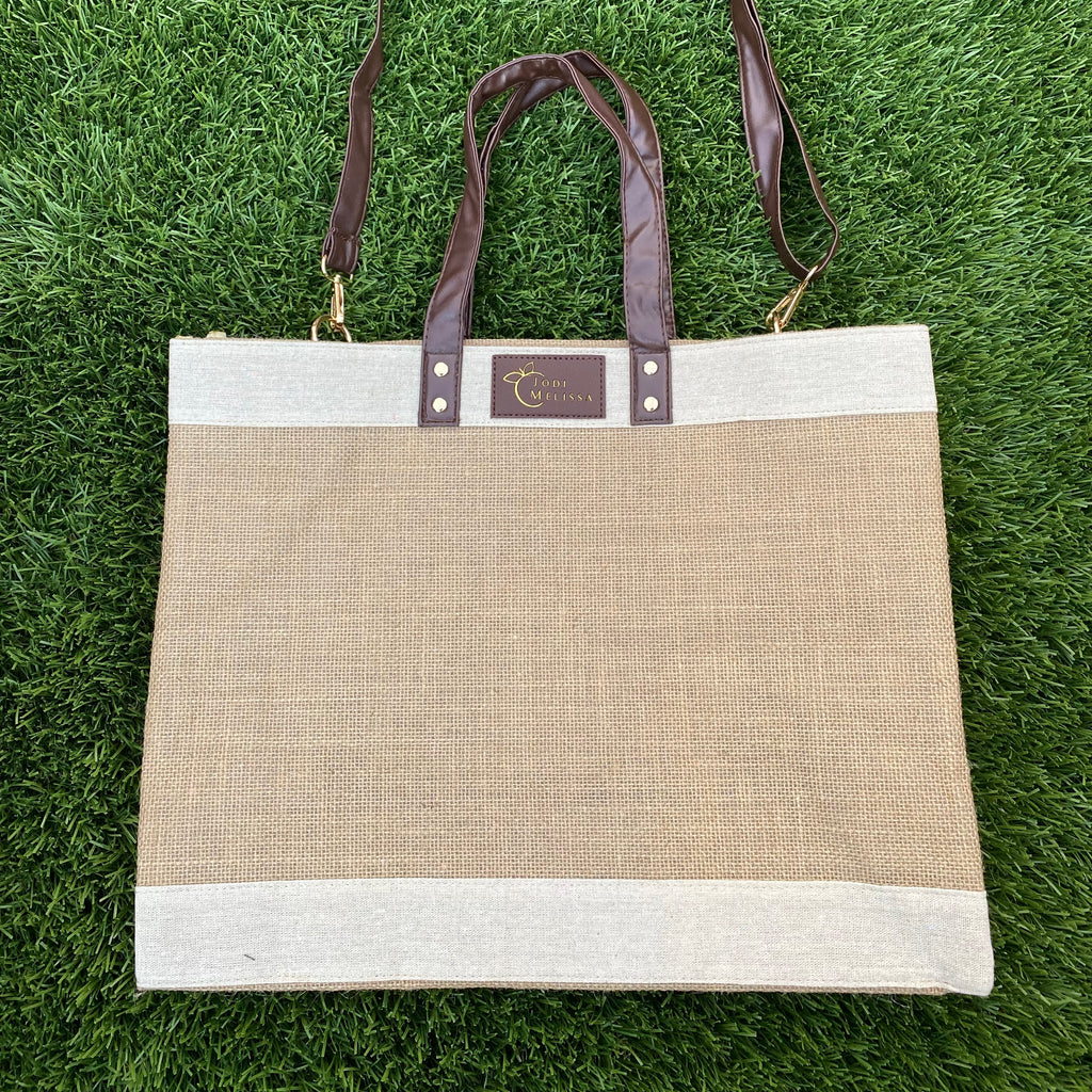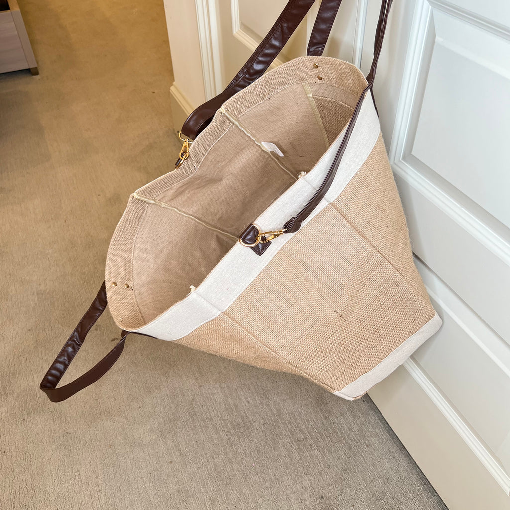 Functional and Fabulous, our eco-friendly jute totes are where luxury meet logic. They are made out of 100% Bangladesh jute (the world's most sustainable fabric) with double thick vegan leather handles and long cross body straps. Use our chic totes for beach trips, days at the pool, errands, grocery shopping or just for carrying all the things. The interior wipes clean so no need to worry about spills and messy contents. You will soon realize you can't live with just one. :-)