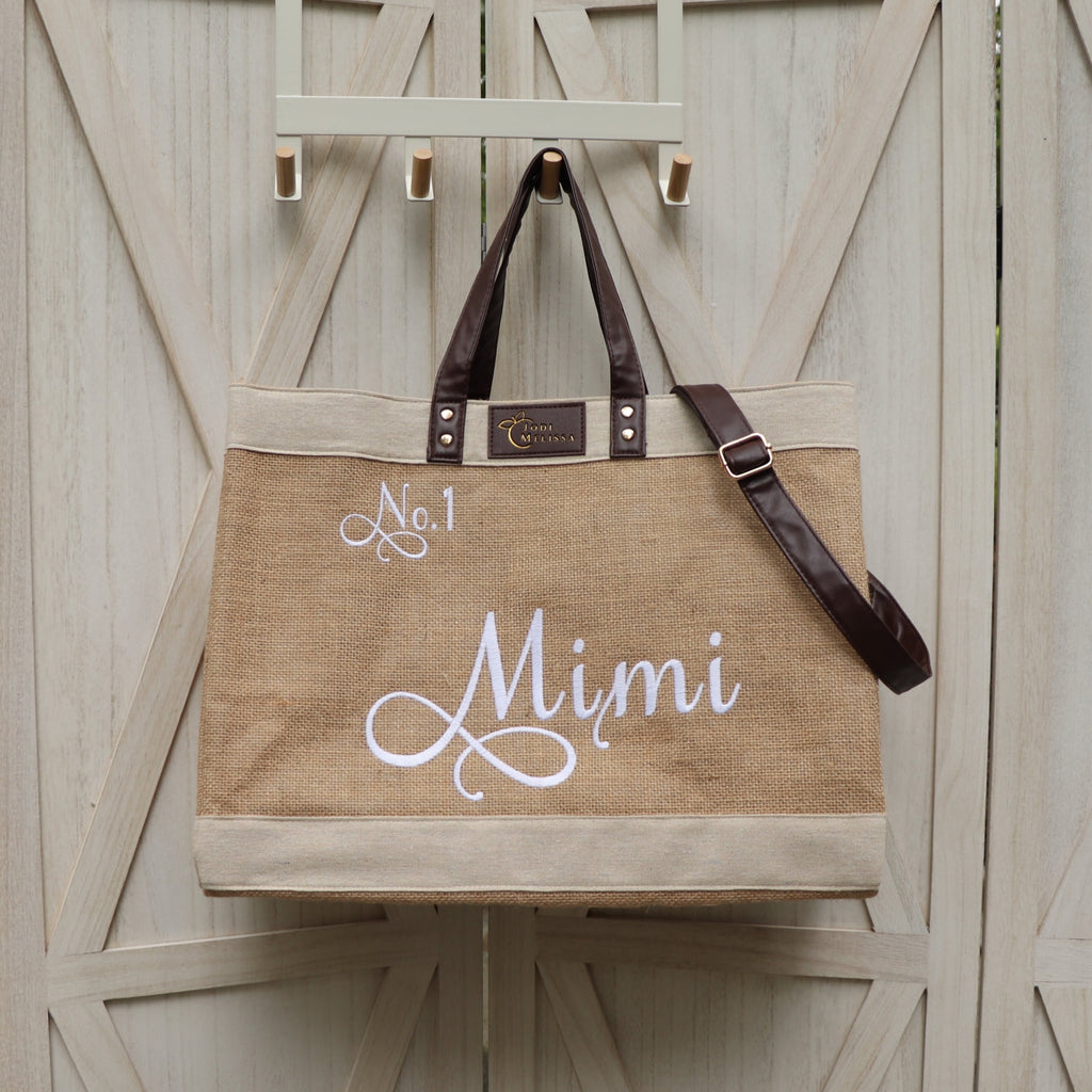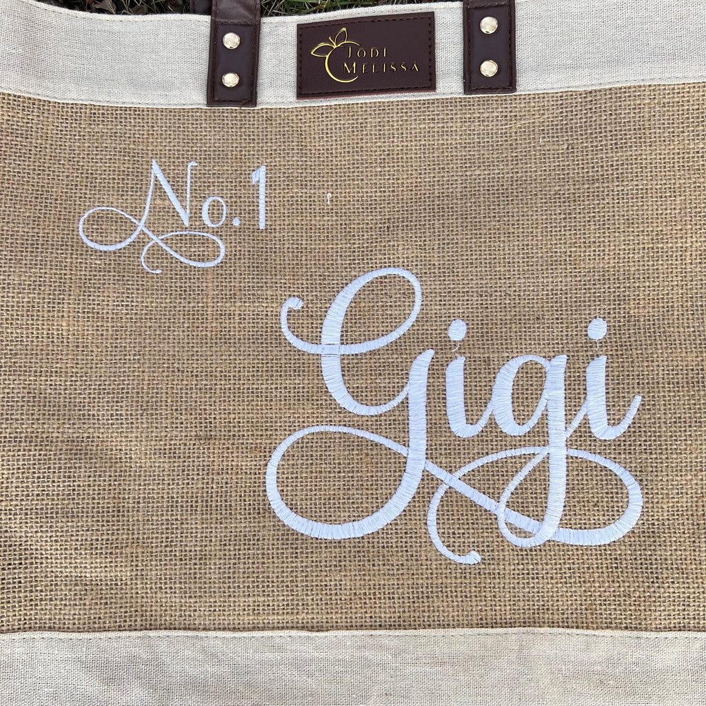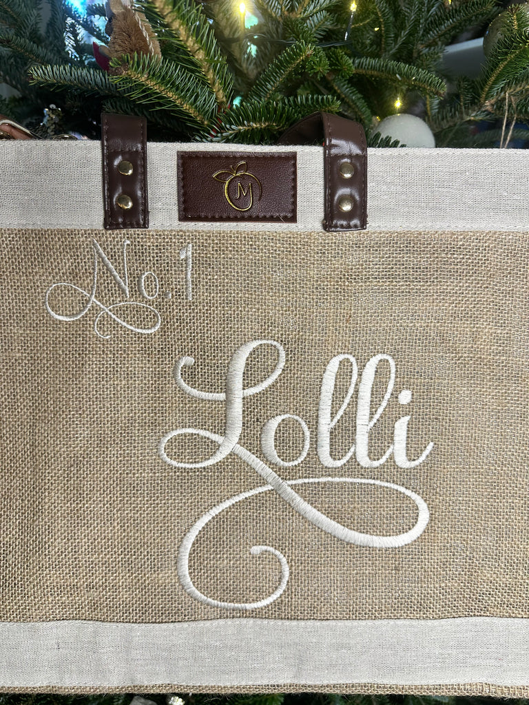 We thought you would love these cute personalized phrases we embroidered on our Big Jo jute bag. Choose your favorites for yourself or someone special.