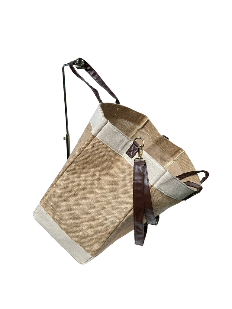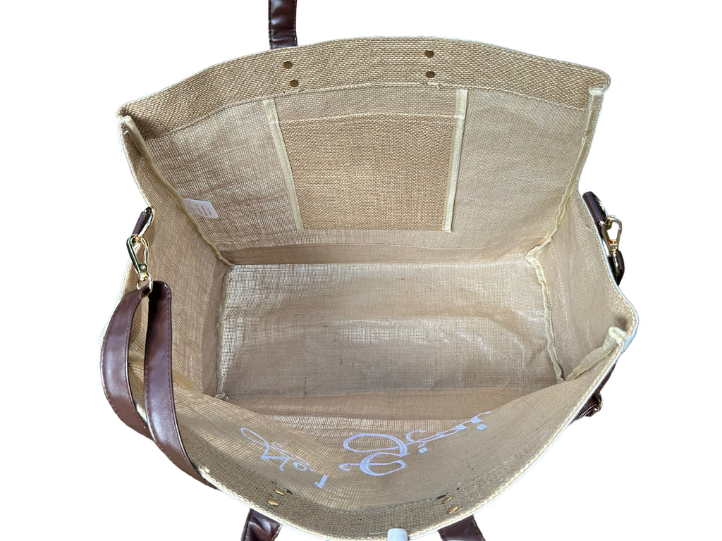 Functional and Fabulous, our eco-friendly jute totes are where luxury meet logic. They are made out of 100% Bangladesh jute (the world's most sustainable fabric) with double thick vegan leather handles and long cross body straps. Use our chic totes for beach trips, days at the pool, errands, grocery shopping or just for carrying all the things. The interior wipes clean so no need to worry about spills and messy contents. You will soon realize you can't live with just one. :-)